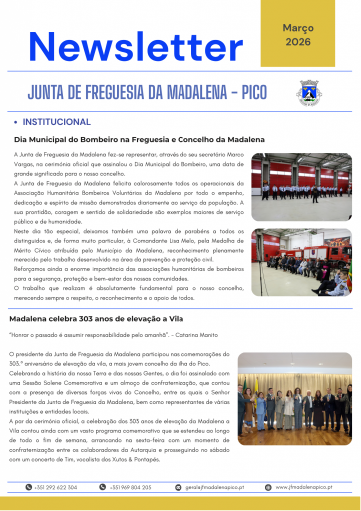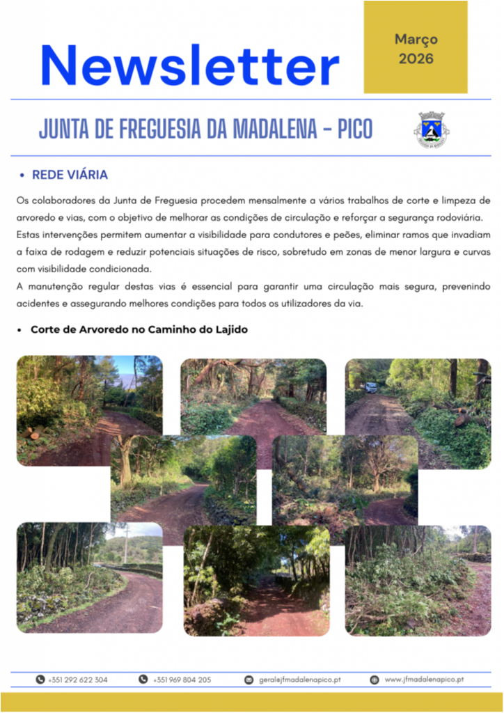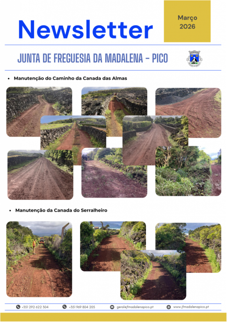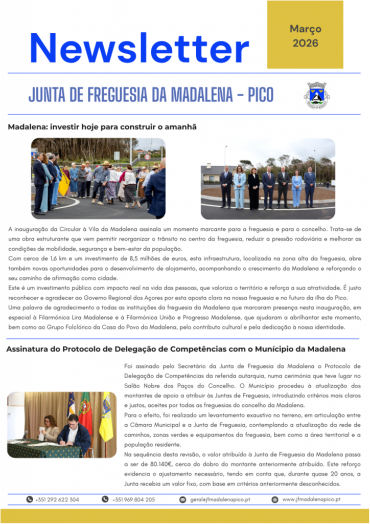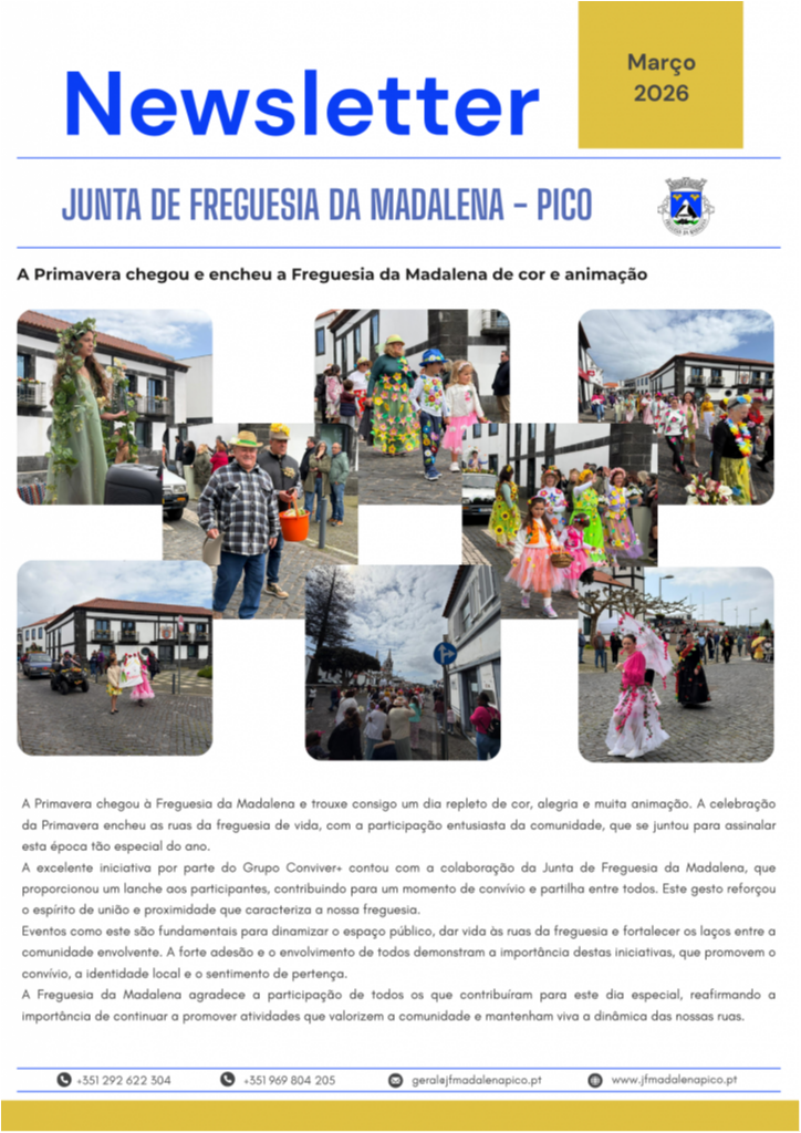 A Junta de Freguesia da Madalena disponibiliza a Newsletter referente ao mês de março, onde são apresentadas as principais atividades desenvolvidas ao longo do mês, bem como as intervenções realizadas na freguesia, nomeadamente ao nível da rede viária, manutenção de espaços públicos e outros trabalhos de interesse para a população.