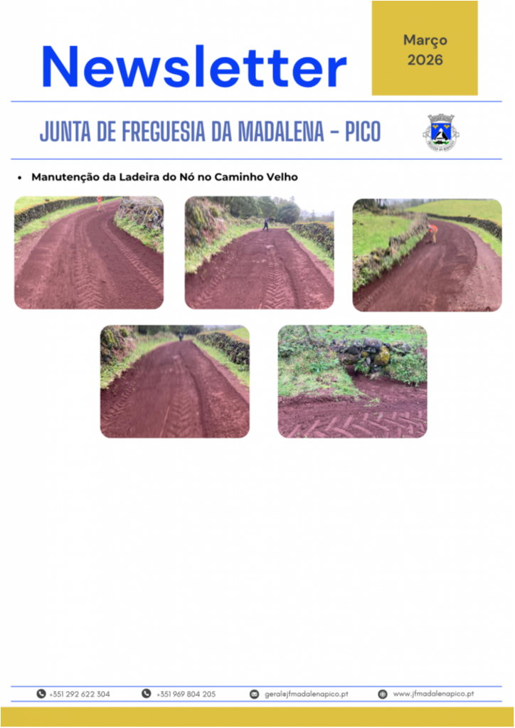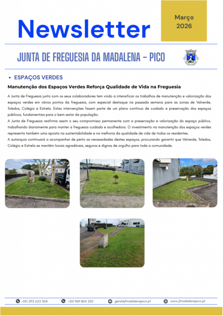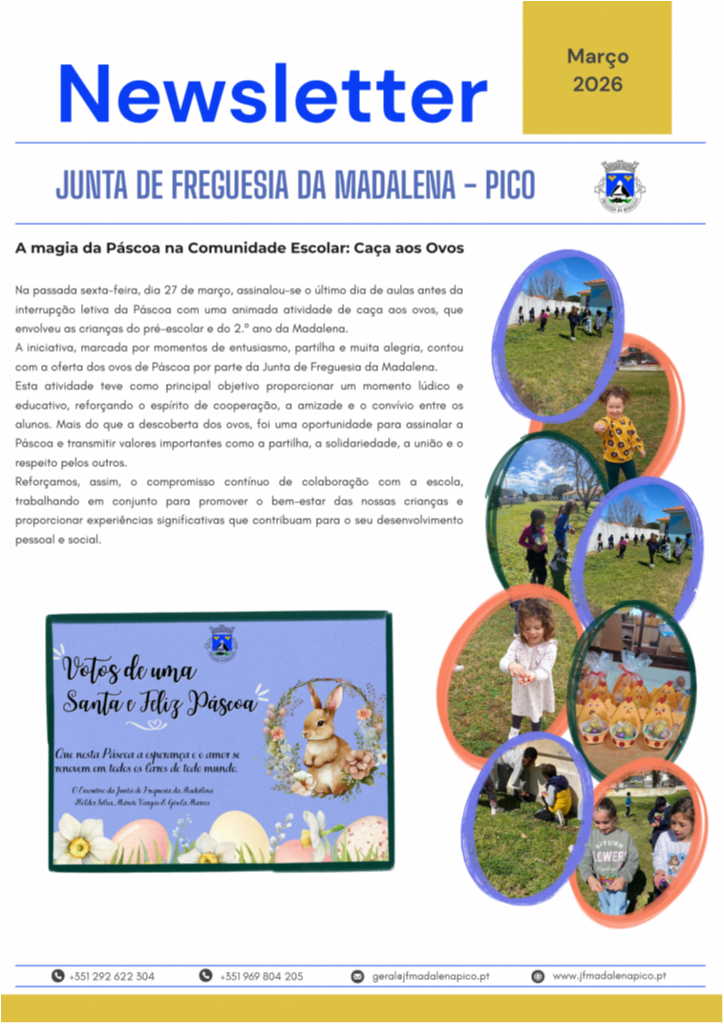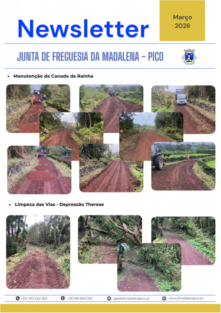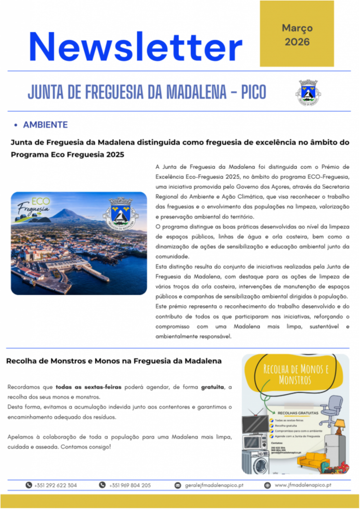 A Junta de Freguesia da Madalena disponibiliza a Newsletter referente ao mês de março, onde são apresentadas as principais atividades desenvolvidas ao longo do mês, bem como as intervenções realizadas na freguesia, nomeadamente ao nível da rede viária, manutenção de espaços públicos e outros trabalhos de interesse para a população.